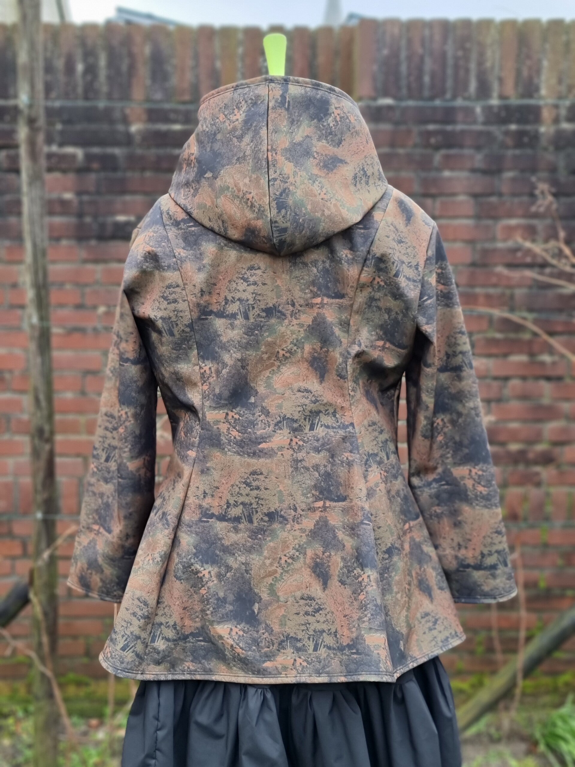 Prachtig model softshell jas maat L/XL in A lijn met capuchon en steekzakken uitgevoerd in een forest motief. De jas is in werkelijkheid groener dan op de foto's, maar dit is helaas op beeld niet vast te leggen.