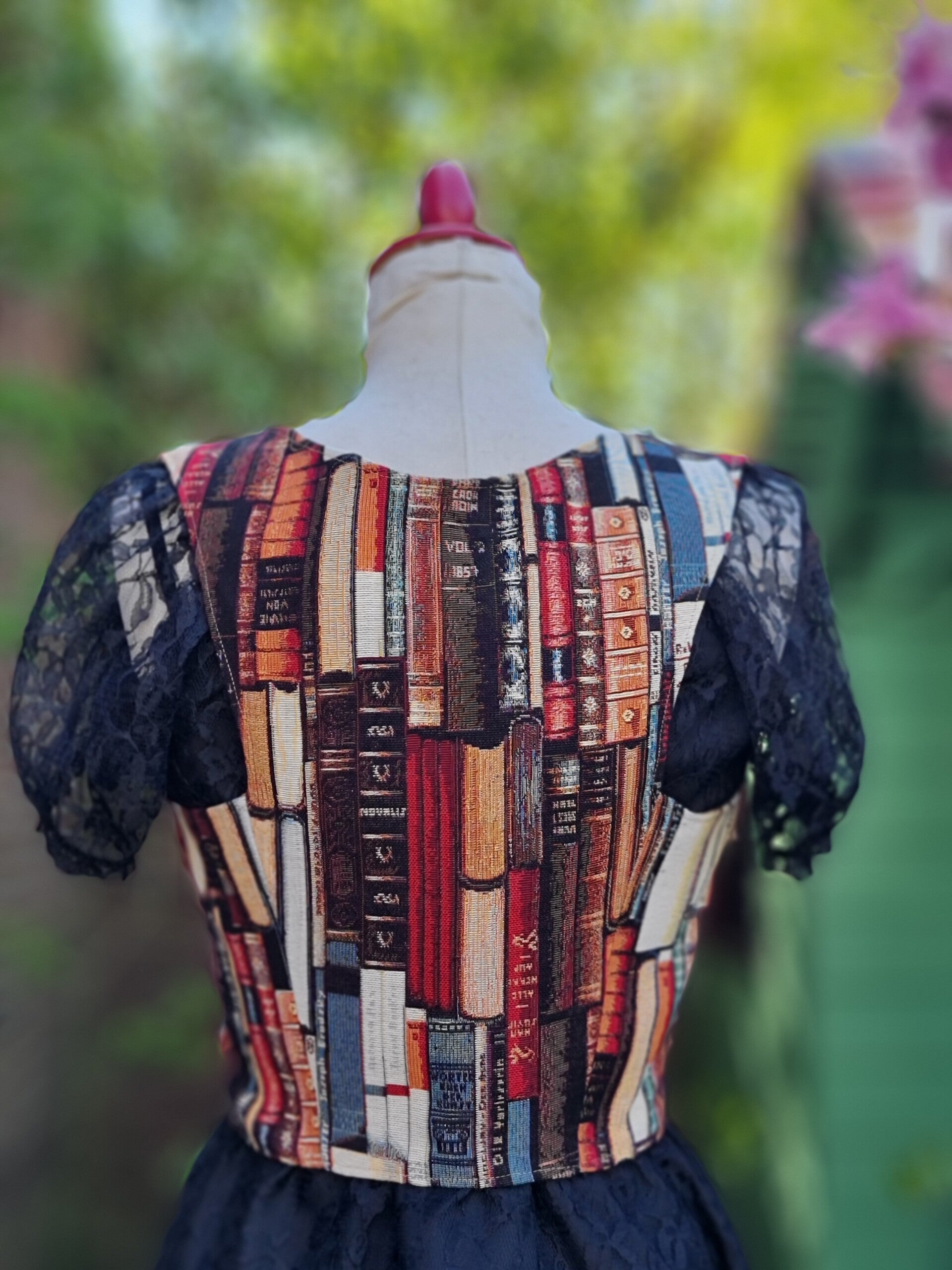 Een echt statement piece! Zo kun je onze corsetten wel noemen! Dit model, uitgevoerd in een kleurrijk boekenmotief is gemaakt van gobelin.