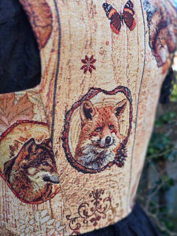 Een echt statement piece! Zo kun je onze corsetten wel noemen! Dit model, uitgevoerd in beige met een hout motief en verschillende bosdieren, is gemaakt van gobelin.