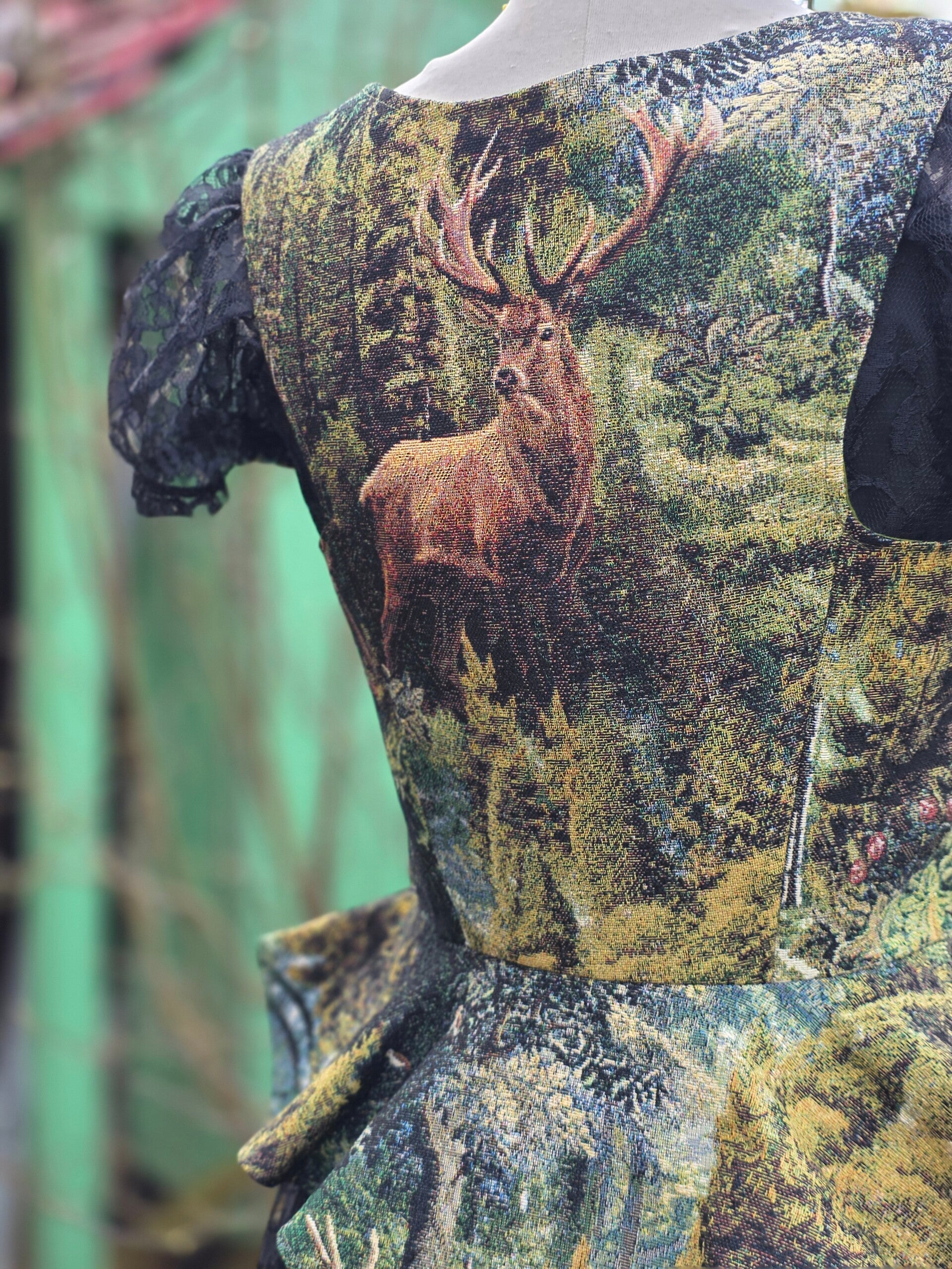 Een echt statement piece! Zo kun je onze corsetten wel noemen! Dit model, uitgevoerd in groen met een hele mooie bosprint met herten, is gemaakt van gobelin.